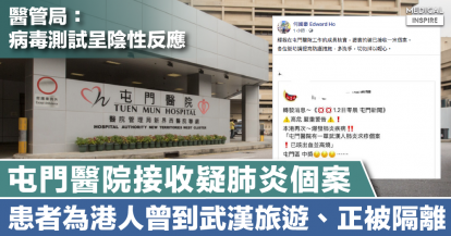 【沙士再現?】屯門醫院接收疑肺炎個案,患者為港人曾到武漢旅遊,醫管局:病毒測試呈陰性反應。