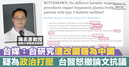 【無懼打壓】台媒:台研究遭強改國籍為「中國」,台醫怒撤論文抗議。