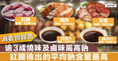 【消委會測試】逾3成燒味及鹵味屬高鈉,紅腸檢出的平均鈉含量最高。