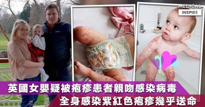 【無妄之災】英國1歲女嬰疑被疱疹患者親吻,全身感染紫紅色疱疹差點送命。
