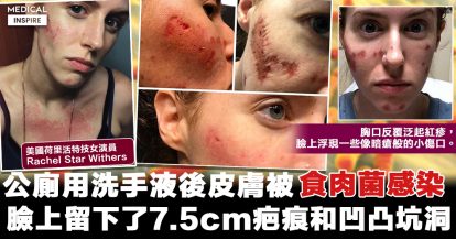 【可怕感染】荷里活特技女演員在公廁用洗手液後皮膚被食肉菌感染,在臉上留下了7.5cm疤痕和凹凸坑洞。